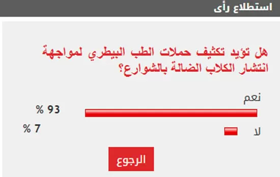 في استطلاع للرأى طرحه اليوم السابع على قرائه الأعزاء تحت عنوان هل تؤيد تكثيف حملات الطب البيطري لمواجهة انتشار الكلاب الضالة بالشوارع؟، أيد غالبية القراء تكثيف حملات الطب البيطري لمواجهة انتشار الكلاب الضالة بالشوارع.