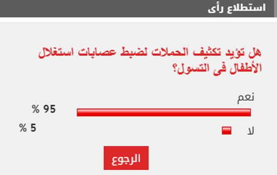 وأيد 95% من القراء مطالب تكثيف الحملات لضبط عصابات استغلال الأطفال فى التسول، بينما عارض 5% من القراء مطالب تكثيف الحملات لضبط عصابات استغلال الأطفال فى التسول.