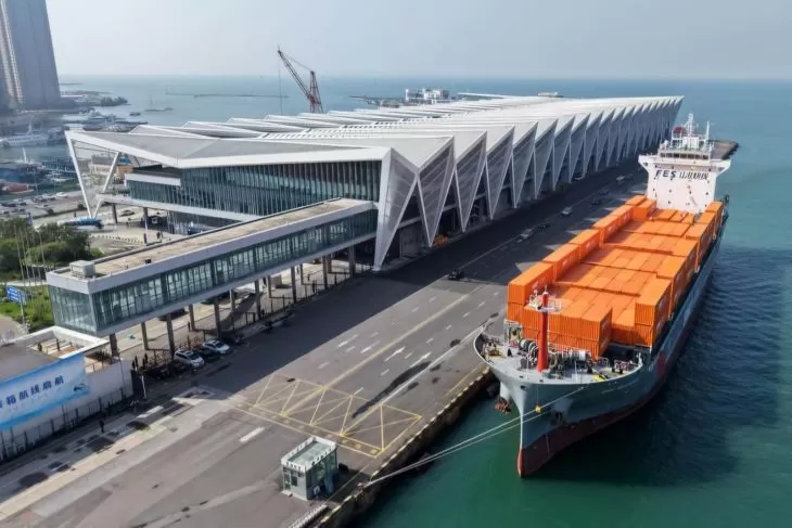 A drone photo taken on Oct. 16, 2025 shows the "SMC RIZHAO" ship performing the maiden voyage of the Qingdao-Jeju container shipping route berthing at the Qingdao International Cruise Terminal in Qingdao, east China's Shandong Province. (ANTARA/HO-Xinhua/Li Ziheng)