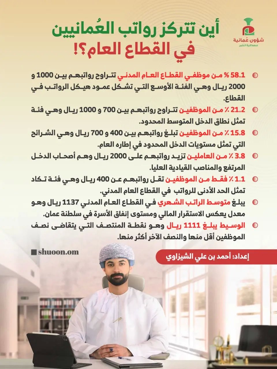يُظهر القطاع العام في سلطنة عمان لعام 2026 هيكلاً رواتب متوازنًا إلى حد كبير، حيث تُشكل الفئة المتوسطة العمود الفقري لهذا القطاع. وفق البيانات، فإن 58.1% من موظفي القطاع العام المدني يتقاضون رواتب تتراوح بين 1000 و2000 ريال عماني شهريًا، مما يجعل هذه الشريحة الأوسع والأكثر تمثيلاً. هذا التوزيع يعكس سياسة تستهدف تحقيق استقرار مالي للأسر العمانية، حيث يبلغ متوسط الراتب الشهري 1137 ريالًا، بينما يصل وسيط الرواتب إلى 1111 ريالًا، مما يشير إلى تمركز كبير للرواتب حول القيمة المتوسطة غقجاج بناء على ما تم الاعلان عنه رسميا من الجهات المختصة .